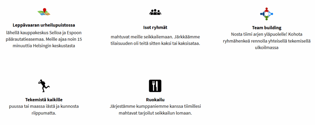 Latvuksiin mahtuu kerralla pari sataa seikkailijaa, seikkailugolfradalle 50 pelaajaa ja pakopeleihin 30 pelaajaa. Tuunataan yhdessä porukallesi unohtumaton tiimipäivä – oli tiimisi miten suuri tai pieni tahansa.