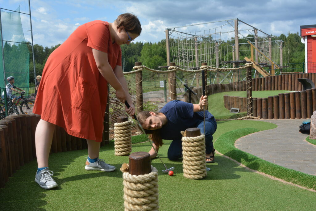 Seikkailuminigolfissa väylät eivät ole irrallisia rakennelmia vaan osa maisemaa. Haasteita lyöjälle tarjoavat ratojen kaltevuus sekä erilaiset esteet − kohokohtana vesieste. Tule pelaamaan!
